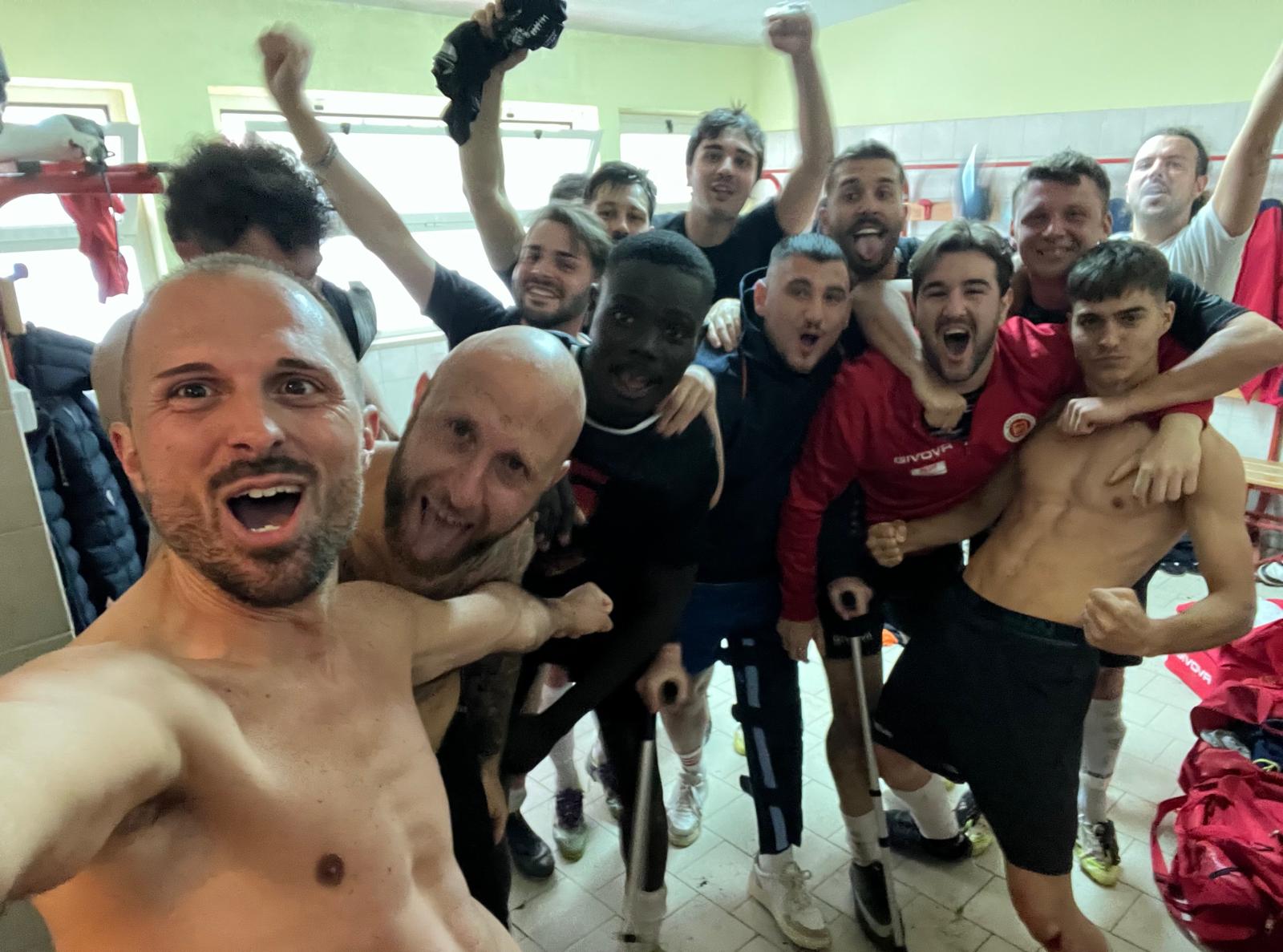 Bella vittoria giallorossa che fa continuare il sogno playoff, festeggiando come in foto negli spogliatoi di Manciano.