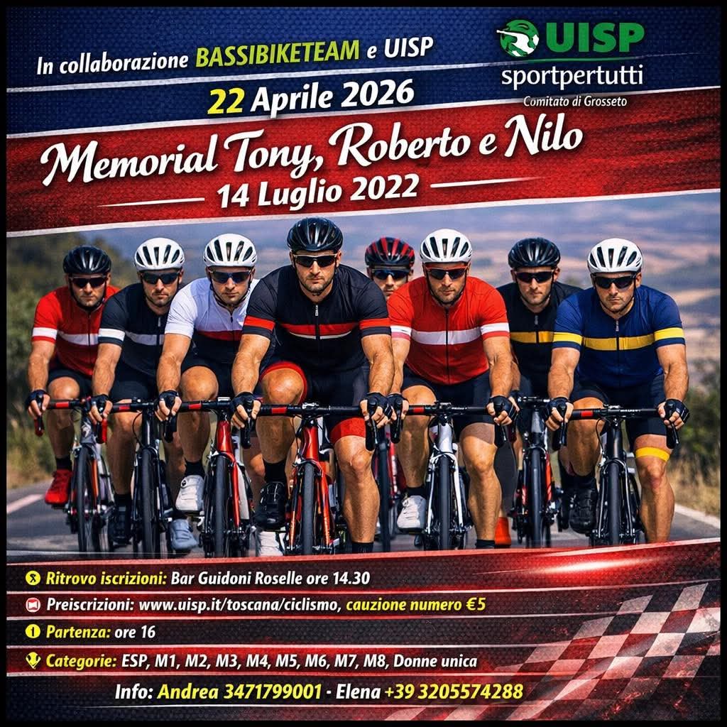 Mercoledì 22 aprile è in programma il Memorial Tony, Roberto e Nilo, appuntamento organizzato in collaborazione da BassiBikeTeam e Uisp Comitato di Grosseto. La gara rientra nel calendario della stagione 2026 e conferma la continuità del movimento amatoriale maremmanno sulle strade del territorio. Con la manifestazione si ricordano Roberto Seripa, Nilo Naldini e Tony Panico, i ciclisti tragicamente scomparsi in un incidente stradale, che vivono ancora nel ricordo degli amici biker.
