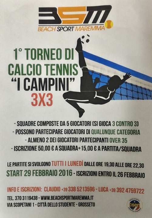 Sono aperte le iscrizioni al primo torneo di calcio tennis “I Campini” organizzato dall’Asd Beach Sport Maremma in collaborazione con il comitato provinciale Csen di Grosseto....