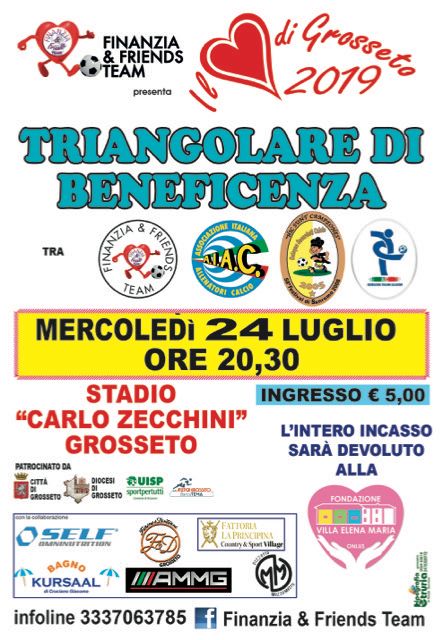 Grosseto. E’ stato posticipato al 24 luglio il “Triangolare di Benficenza” organizzato da “Finanzia & Friends” che vedrà la partecipazione della Selecao Sacerdoti e dall’Aiac e...